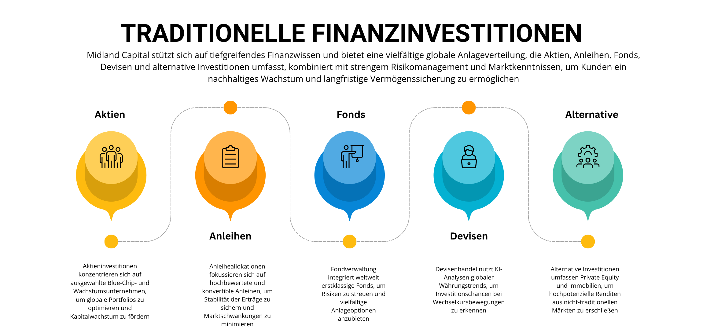 Midland Capital bietet vermögenden Kunden maßgeschneiderte Dienstleistungen, gestützt auf unser professionelles Forschungsteam und globale Ressourcen. Wir entwickeln individuelle Portfolios basierend auf den finanziellen Zielen und Risikotoleranzen der Kunden, einschließlich traditioneller Finanzen, digitaler Vermögenswerte und grüner Investitionen. Unsere Vermögensberater bieten persönliche Beratung an, verfolgen Marktentwicklungen in Echtzeit und passen Strategien dynamisch an. KI-unterstützte Analysen gewährleisten wissenschaftlich fundierte Entscheidungen. Darüber hinaus bieten wir globale Anlageoptionen und legen großen Wert auf Datenschutz sowie Sicherheit durch führende Treuhandinstitute. Wir streben eine langfristige Partnerschaft an.